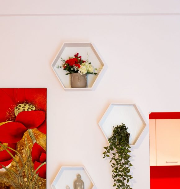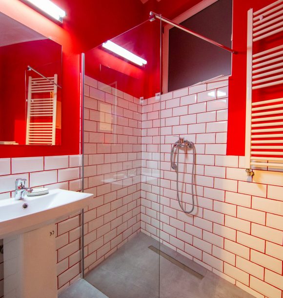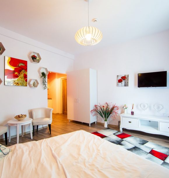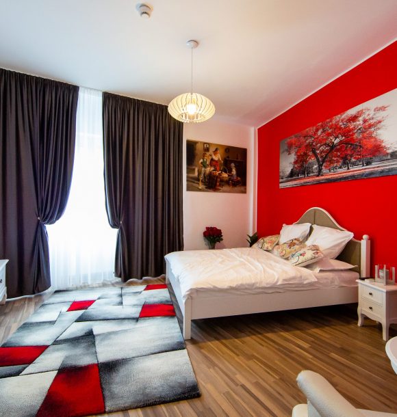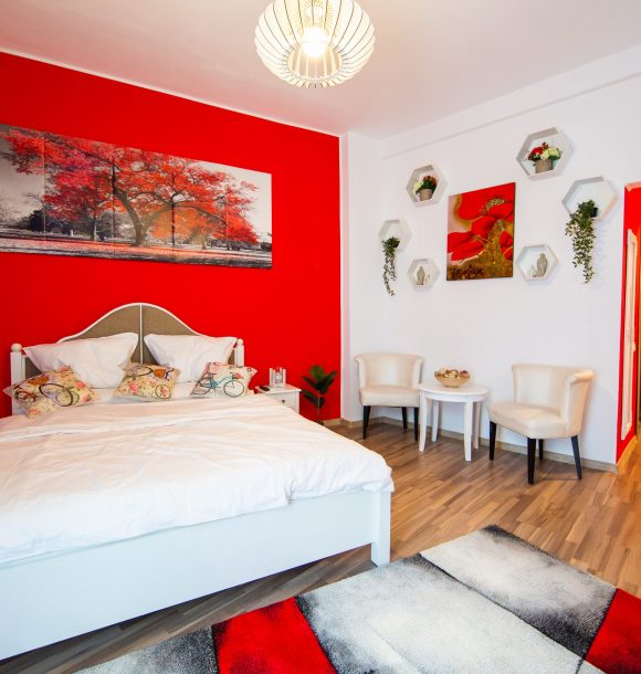 Camera roșie: vopsit perete în culoarea roșu, baie integral în culoare roșu cu toate dotările necesare, inclusiv uscător de par și produse de îngrijire hoteliere, amenajare și executare la comandă mini chicinetă din pal alb.
