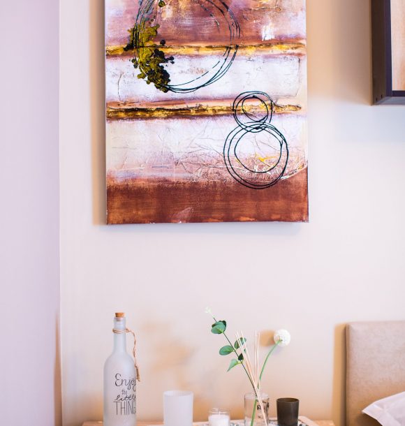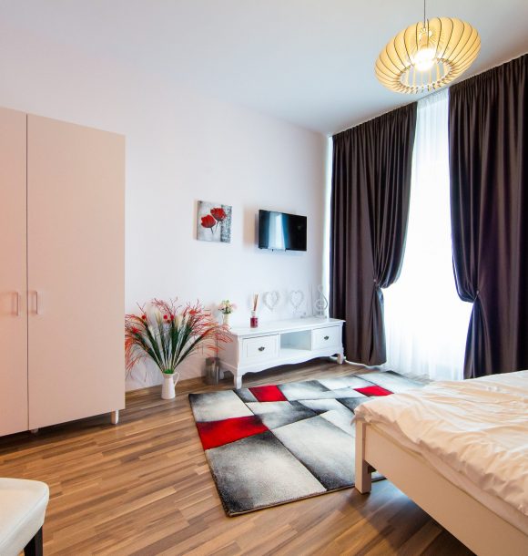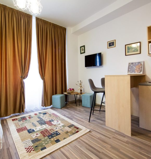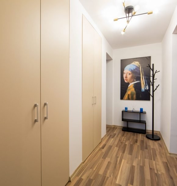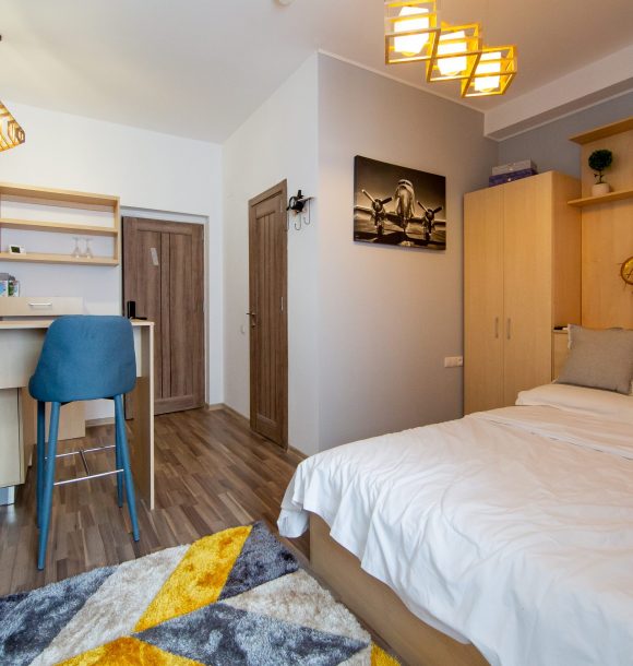 Mobilă și decor: pat matrimonial catifea, cu lenjerie albă de hotel, perne de puf de gâscă, saltea ortopedică, perne decorative colorate, două noptiere din pal culoare cappucino, dulap din pal culoare cappucino cu rafturi și suport pentru umerașe, halat inclus, fier și masă de călcat, papuci de unică folosință, două taburete crem Jysk cu măsuță de cafea din lemn natur, televizor led de 80 cm, difuzor de parfum, covor colorblock, perdea de mătase și draperie blackout din catifea, ușa cu sistem digital de deschidere și touchscreen, diverse tablouri și decorațiuni Mobexpert, corpuri de iluminat Eglo.