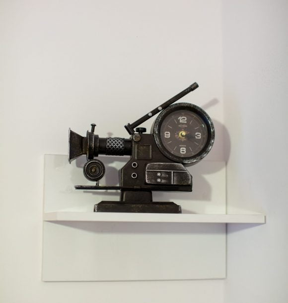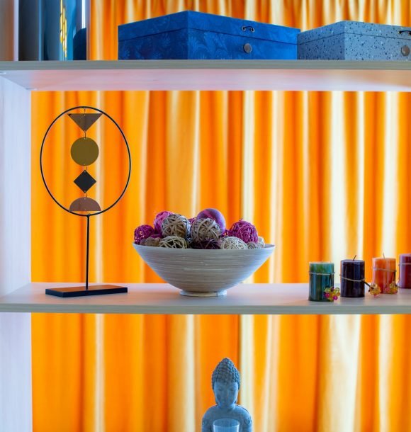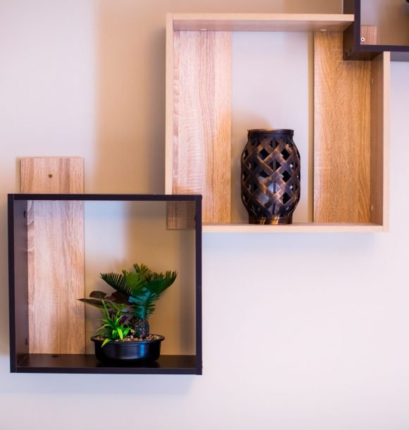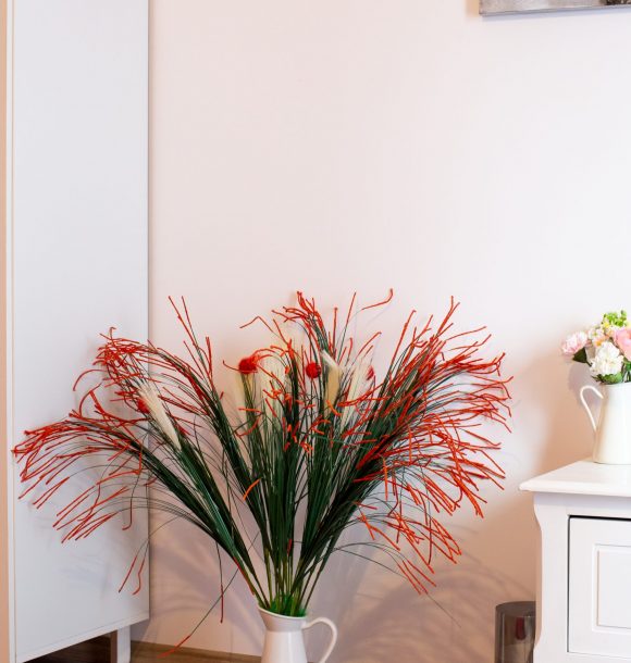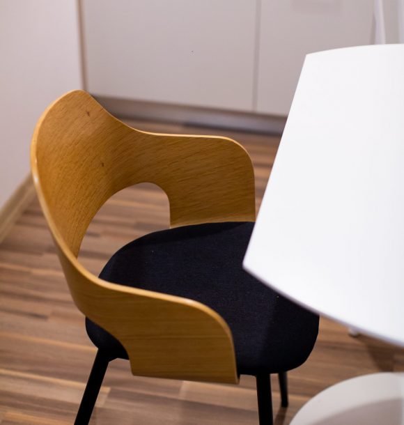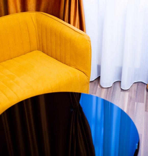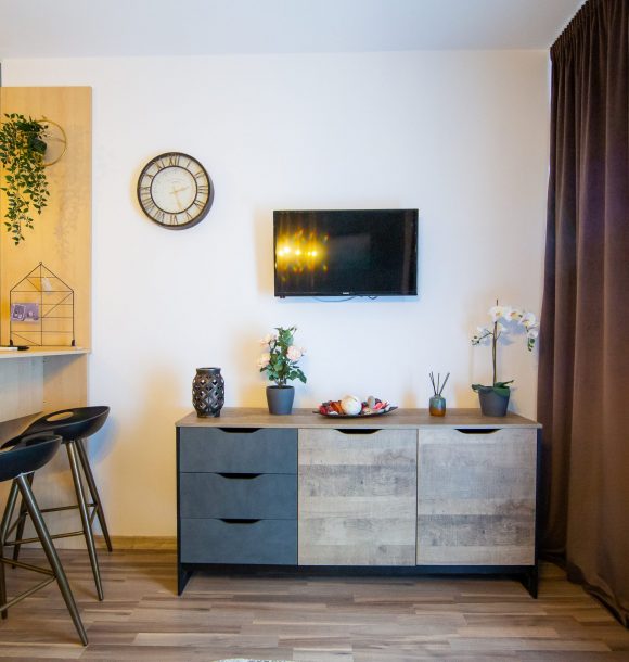 Mobilă și decor: două scaune din mdf alb cu masă dining din mdf alb, canapea din textil portocaliu, scaun decorativ din lemn, amenajare perete din sticlă securizată oglindă între chicineta și dormitor, pat matrimonial din mdf alb, cu lenjerie albă de hotel, perne de puf de gâscă, saltea ortopedică, perne decorative colorate, noptieră din mdf negru, dulapuri din mdf alb cu rafturi și suport pentru umerașe, halat inclus, fier și masă de călcat, papuci de unică folosință, televizor led de 80 cm, difuzor de parfum, două covoare colorblock, perdele de mătase și draperii blackout din catifea, ușa cu sistem digital de deschidere și touchscreen, diverse tablouri și decorațiuni Mobexpert, corpuri de iluminat Eglo.