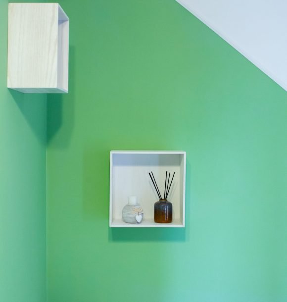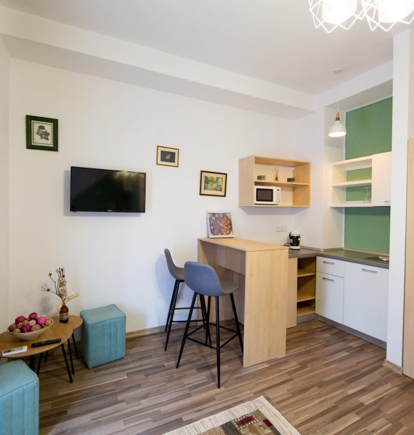 Camera verde deschis: vopsit pereți în culoarea verde deschis, baie integral în culoarea verde deschis cu toate dotările necesare, inclusiv uscător de par și produse de îngrijire hoteliere, amenajare și executare la comandă mini chicinetă din pal lemn natur.
