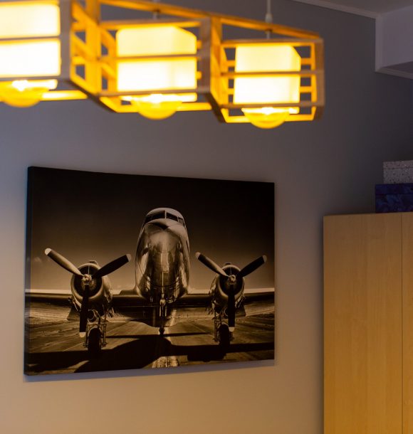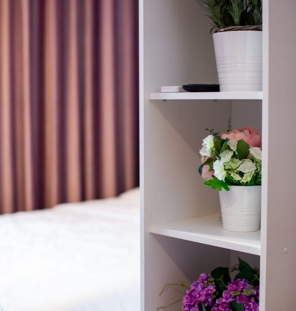 Mobilă și decor: pat matrimonial cu lenjerie albă de hotel, perne de puf de gâscă, saltea ortopedică, perne decorative colorate, două noptiere din pal alb, două fotolii albe și măsuță de cafea, dulap din mdf alb cu rafturi și suport pentru umerașe, halat inclus, fier și masă de călcat, papuci de unică folosință, televizor led de 80 cm, comodă tv din pal alb la comandă, difuzor de parfum, covor colorblock, perdea de mătase și draperie blackout din catifea, ușa cu sistem digital de deschidere și touchscreen, diverse tablouri și decorațiuni Mobexpert, oglindă în mărime naturală Jysk, corpuri de iluminat Eglo.