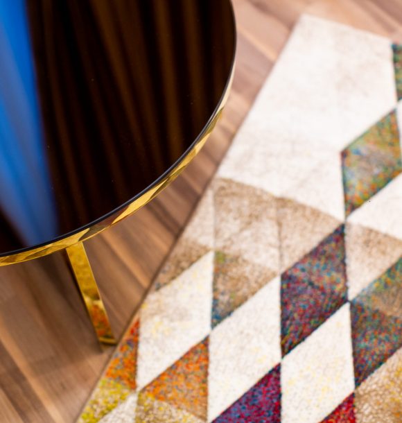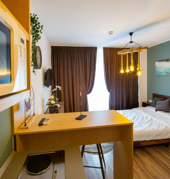 Mobilă și decor: pat matrimonial cu lenjerie albă de hotel, perne de puf de gâscă, saltea ortopedică, perne decorative colorate, două taburete din catifea verde cu măsuță de cafea, corpuri decorative suport pentru decorațiuni din pal lemn natur, cuier cu sertar din pal lemn natur, halat inclus, fier și masă de călcat, papuci de unică folosință, televizor led de 80 cm, difuzor de parfum, covor colorblock, perdea de mătase și draperie blackout din catifea, ușa cu sistem digital de deschidere și touchscreen, diverse tablouri și decorațiuni Mobexpert, corpuri de iluminat Eglo, amenajare bar din pal lemn natur cu două scaune de bar din textil gri.