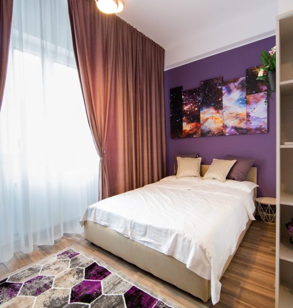 Mobilă și decor: pat matrimonial catifea, cu lenjerie albă de hotel, perne de puf de gâscă, saltea ortopedică, perne decorative colorate, două taburete din catifea mov și măsuță de cafea din sticlă, dulap din pal culoare natur cu rafturi și suport pentru umerașe, halat inclus, fier și masă de călcat, papuci de unică folosință, televizor led de 80 cm, difuzor de parfum, covor colorblock, perdea de mătase și draperie blackout din catifea, ușa cu sistem digital de deschidere și touchscreen, diverse tablouri și decorațiuni Mobexpert, corpuri de iluminat Eglo.