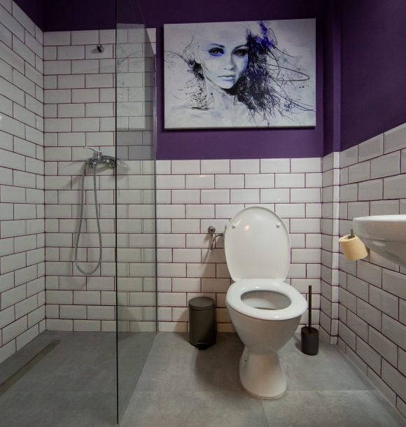 Camera culoare mov: vopsit pereți în culoarea mov, baie integral în culoarea mov cu toate dotările necesare, inclusiv uscător de par și produse de îngrijire hoteliere, amenajare și executare la comandă mini chicinetă din pal lemn natur.