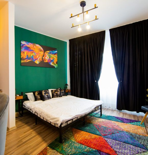 Mobilă și decor: pat matrimonial din fier negru, cu lenjerie albă de hotel, perne de puf de gâscă, saltea ortopedică, perne decorative colorate, două scaune din piele ecologică neagră și măsuță de cafea din sticlă, 2 noptiere cu inserții de fier negru, dulap din pal culoare natur cu rafturi și suport pentru umerașe, halat inclus, fier și masă de călcat, papuci de unică folosință, televizor led de 80 cm, difuzor de parfum, covor colorblock, perdea de mătase și draperie blackout din catifea, ușa cu sistem digital de deschidere și touchscreen, diverse tablouri și decorațiuni Mobexpert, corpuri de iluminat Eglo.