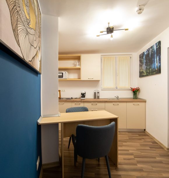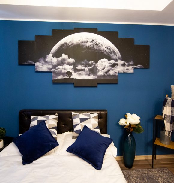 Camera culoare albastru închis: vopsit pereți în culoarea albastru închis, baie integral în culoarea albastru închis cu toate dotările necesare, inclusiv uscător de păr și produse de îngrijire hoteliere, amenajare și executare la comandă mini chicinetă din pal lemn natur.